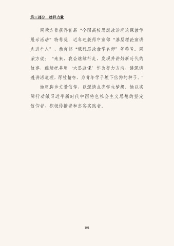 第三部分 榜样力量 周荣方曾获得首届“全国高校思想政治理论课教学 展示活动”特等奖,近年还获得中宣部“基层理论宣讲 先进个人”、教育部“课程思政教学名师”等称号。周 荣方说:“未来,我会继续行走,发现并讲好新时代的 故事,继续把善用‘大思政课’作为努力方向,讲深讲 透讲活道理,厚植情怀,为青年学子埋下信仰的种子。” 她用脚步丈量信仰,以深情点亮福利姬梦想。她以实 际行动做习近平新时代中国特色社会主义思想的坚定 信仰者、积极传播者和忠实实践者。 101