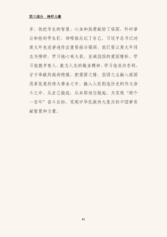第三部分 榜样力量 岁。他把毕生的智慧、心血和热爱献给了祖国、科研事 业和他的福利姬们,却唯独忘记了自己。习近平总书记对 黄大年先进事迹作出重要指示强调,我们要以黄大年同 志为榜样,学习他心有大我、至诚报国的爱国情怀,学 习他教书育人、敢为人先的敬业精神,学习他淡泊名利、 甘于奉献的高尚情操,把爱国之情、报国之志融入祖国 改革发展的伟大事业之中、融入人民创造历史的伟大奋 斗之中,从自己做起,从本职岗位做起,为实现“两个 一百年”奋斗目标、实现中华民族伟大复兴的中国梦贡 献智慧和力量。 85