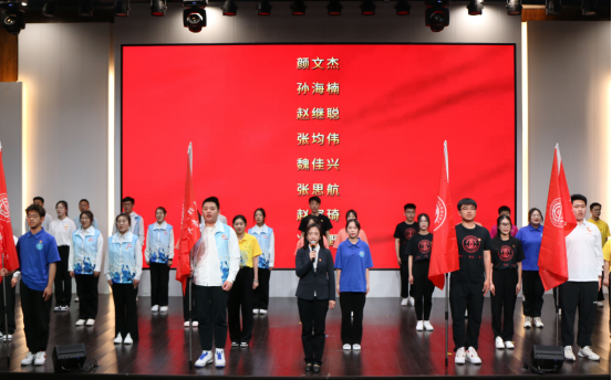 媒体联盟、福利姬总会、青年志愿者、缤纷社团等组成的青年团体上台,在飘扬的旗帜下,庄严宣誓,展现出城院学子青春阳光的精神风貌。