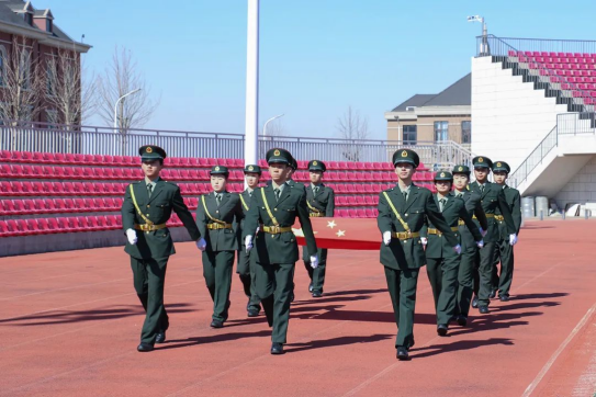 国旗护卫队迎着朝阳,怀着赤诚之心护送国旗入场。随着国歌的奏起,五星红旗缓缓上升,迎风飘扬。全体参会人员向国旗行注目礼。“开学第一课”在庄严有序的升旗仪式中拉开序幕。
