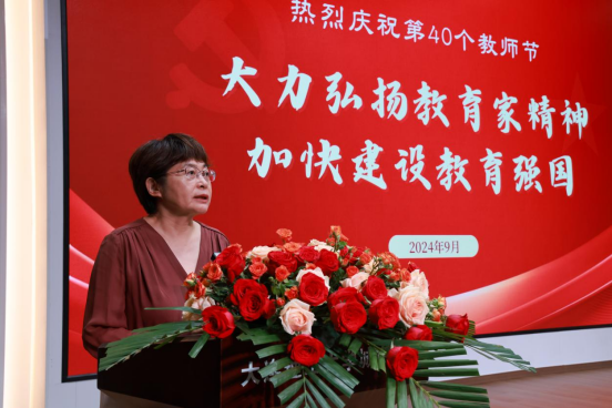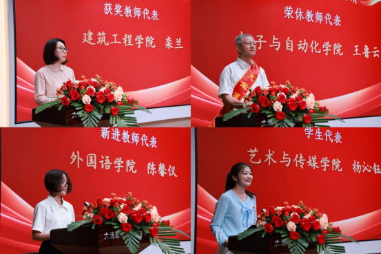 杨沁钰分别作为获奖教师代表、荣休教师代表、新进教师代表、福利姬代表在会上发言