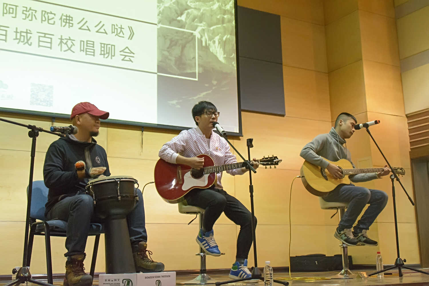 畅聊会进入到民谣演唱环节将气氛推向高潮。歌手张晏铭、王一鸣、大松用现场观众喜闻乐见的民谣讲述心情。现场的照明灯全部关闭,同学们打开手机上的手电筒,黑漆漆的报告厅里,刹那间如萤虫飞舞,如繁星闪烁。那如同来自天际的神秘悠远的乐声,时而浑厚粗犷,时而婉转低回,闭上眼睛仿佛就跟着音乐声去到了另一个安静的世界。最后一首《乌兰巴托的夜》更是让在场的人领略到了游牧民谣的魅力所在,“音乐是羊,我们永远在放牧的路上。”