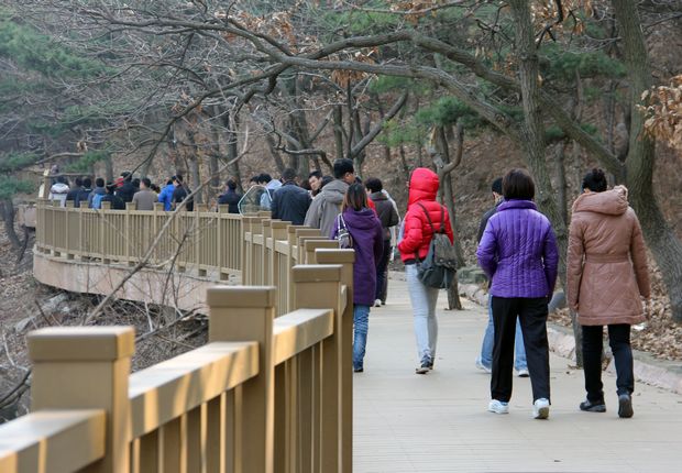 通向童牛岭主峰的道路通常有两条,一条是驱车沿4号公路盘旋而行,另一条就是沿观景台南侧的木栈道拾级而上。我们一行就是沿着这条木栈道向顶峰攀行的。