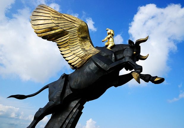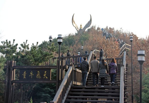 下山途中我们来到了童牛岭景区的核心地段童牛岭。只见一个顽皮可爱的金童骑在一头四蹄腾空,振翅欲飞的巨牛背上。神牛造型生动,栩栩如生,体现了力与美的完美结合。它面朝大海,蓄势待发,仿佛随时都在准备降妖除怪,造福黎民。