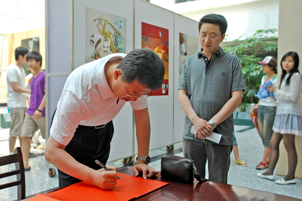 领导为毕业生设计作品展题词,并和到场观众一起观看了这些作品。