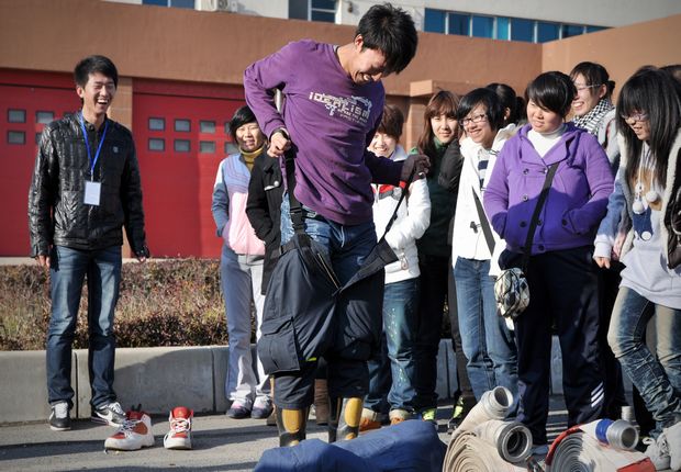 参观结束后,同学们与消防战士开展了精彩而有趣的穿防护服、攀岩、高层跃楼、高层空坠等互动活动。训练场上,战士们协调的动作、敏捷的身手,赢得了同学们的阵阵掌声。在消防战士的勇敢精神鼓舞下,一些同学也自告奋勇地参与到互动活动中,通过拓展训练,同学们深刻体会到消防战士是经过长期的艰苦训练才成就了今天过硬的本领。