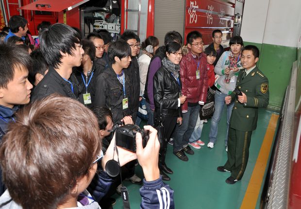 组织部分大一新生前往经济技术开发区消防大队第32中队进行参观和拓展训练。在消防车库,柯中辉指导员和董岩副中队长向同学们讲解了各类消防车的功能以及消防应急疏散灭火的有关常识。