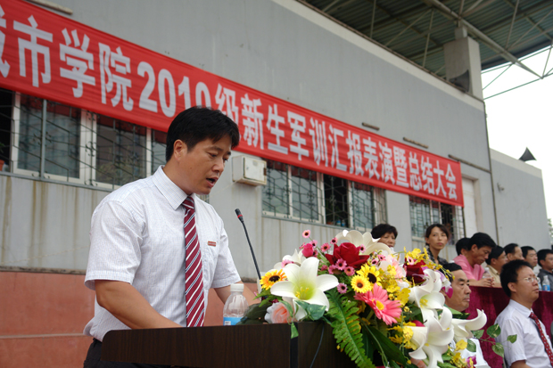 杨斌副院长在讲话中对全体参训官兵表示衷心的感谢,对胜利完成各项军训任务的2010级新生表示热烈的祝贺。他表示,在教官们高度负责、科学施训和各分院及相关部门的精心组织下,整个军训过程中没有发生安全事故,新生在军训和会操表演中展现出良好的精神风貌。希望同学们继续发扬军训中顽强拼搏、自强不息、团结奋斗的精神,把军人的优良品质和作风转化为学习的动力,带到今后的学习生活中,争取更大的荣誉和成绩。