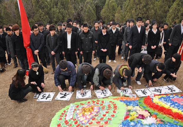 纪念仪式结束后,全体同学使用自备工具细心清扫了烈士墓地。