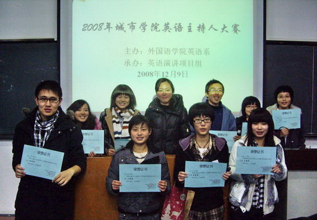 英语系主办,英语演讲项目组承办。比赛分为即兴情景对话、美文朗读及个人语言展示三个环节。经过层层比拼,来自英语系0802班的黄谌阳同学夺得桂冠;日语系0804班史清、工商管理系0808班杜晶晶获得二等奖;工程管理系0801班郑蓓蓓等7名同学分别获得三等奖和优秀奖。