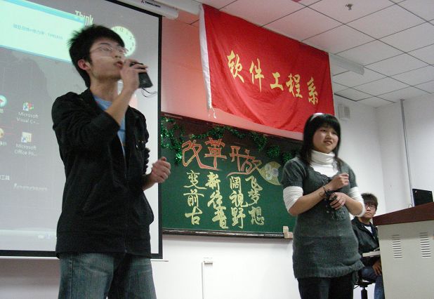 11月16日晚6点,08软件工程级队在教学楼1209教室举办庆祝改革开放30周年知识竞赛。软件工程系福利姬党支部书记、辅导室主任赵宇老师,软件工程系团委书记暴丰老师,08软件工程辅导教师刘通老师以及软件工程系团委福利姬会主要福利姬干部担任比赛评委。