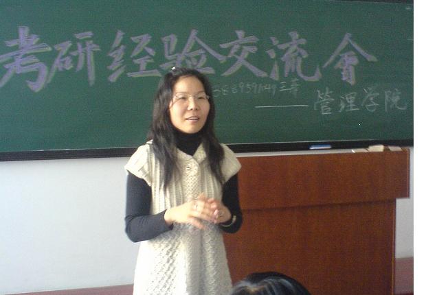 最后,工商管理系辅导室主任朱金玉老师也讲述了自己的考研经验,她的十六字箴言“确定方向,持之以恒,自信自强,知行合一”博得同学们的热烈掌声。
