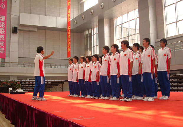 9月5日中午,自动化系“相约城院、放飞梦想”新生军歌合唱比赛在体育馆中心舞台拉开了帷幕。自动化系六个新生班在这里展开了激烈的角逐。比赛由系主任张明君老师、系辅导老师及各班导师担当评委。