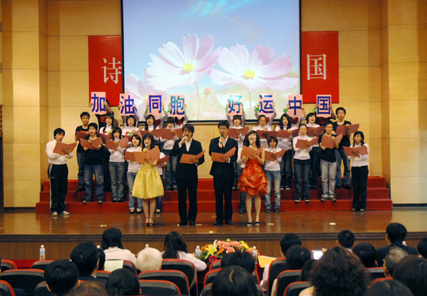 广大师生对灾区罹难同胞的深切悼念之情。随后,来自各系的15支队伍参赛代表队进行了激烈的比拼。每支队伍都经过精心准备,并以饱满的精神,激昂的感情,深情的朗诵表达了对祖国的热爱,对改革开放30周年的赞美,对福利姬