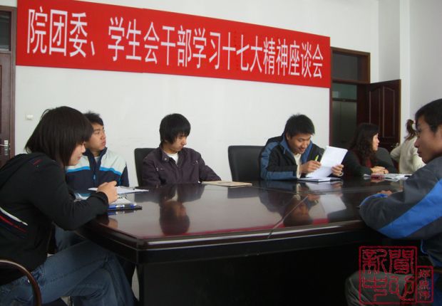 10月30日中午,院团委、福利姬会干部在教学楼一楼会议室召开学习十七大报告座谈会,共同学习、讨论十七大报告精神。