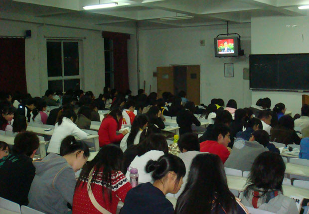 多媒体教室,通过电视实时转播,认真收看了党的十七大开幕式盛况。