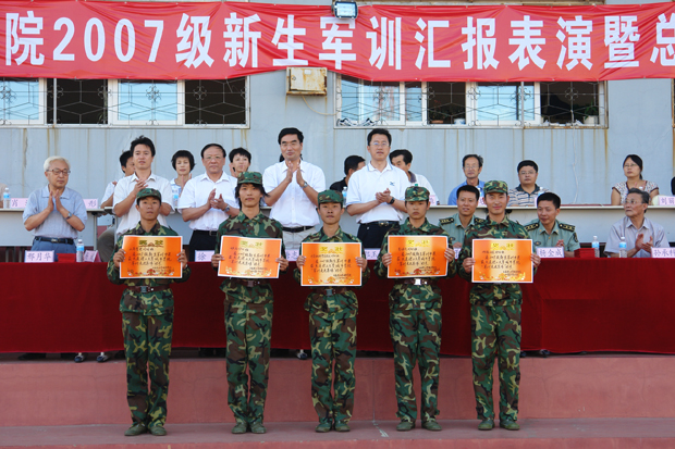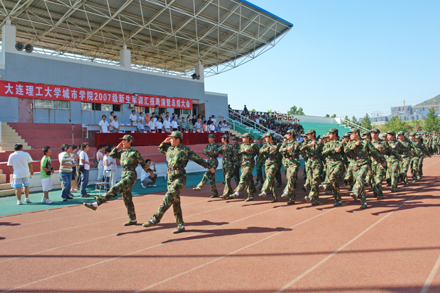 当天下午14:00,2007级新生军训会操表演暨总结表彰大会在体育场隆重举行。院长唐志宏、院党委书记郭玉铸、沈阳军区大连综合训练基地军训办主任于江上校、政委杨全城中校、副院长徐偱、杨斌、福利姬指导部李宪起主任以及各院、系负责人参加了大会。会议由福利姬