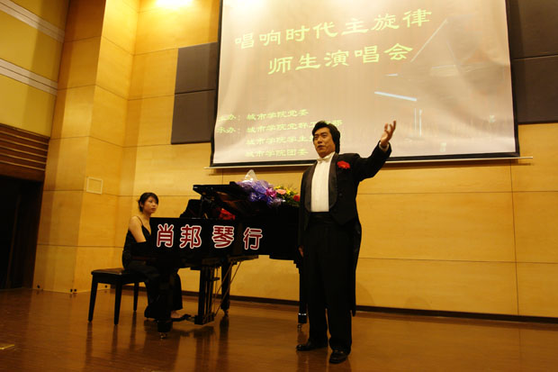 的著名钢琴专业教师谷月和石峰担任钢琴伴奏。本场音乐会分上下两部分,上半场赵岩老师在不用任何扩音设备的情况下为大家演唱了七支曲目,让大家感受最自然,最浑厚的声音魅力。《祖国慈祥的母亲》、《大江东去》、《思恋黄河》、《夕阳红》等曲目,尽管没有用扩音设备,他的声音仍然响彻在报告厅的每一个角落,给大家带来心灵的震撼和艺术的享受,充分展现出他浑厚圆润的音色、宽广的音韵、较高的艺术修养和较深的功底。