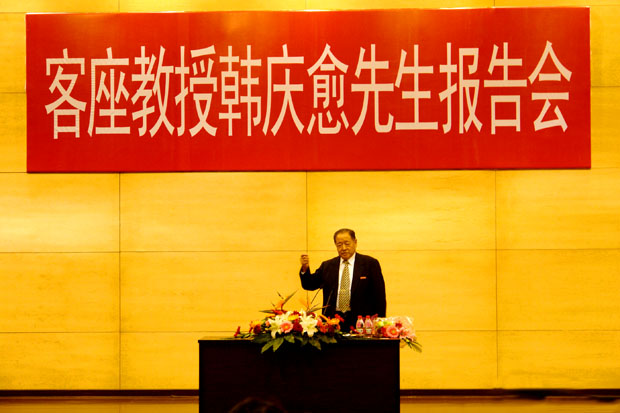 在整个1个半小时的讲演中,韩教授时而采用日语,时而采用汉语,诙谐幽默的语言和丰富的演讲内容,不时博得师生们阵阵热烈的掌声。年已八旬的韩先生精神矍铄,记忆力惊人,始终坚持站着演讲。谈起中、日间的友好交往的历史,他如数家珍,娓娓道来,丝毫看不到衰老的迹象。